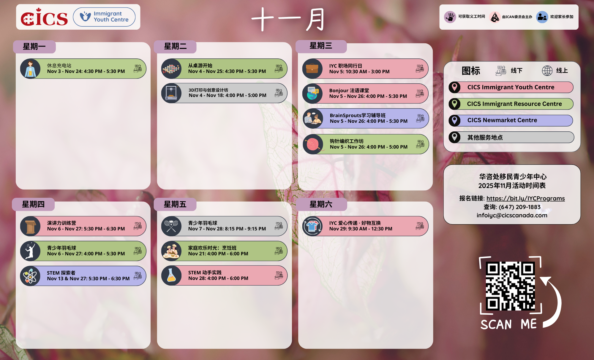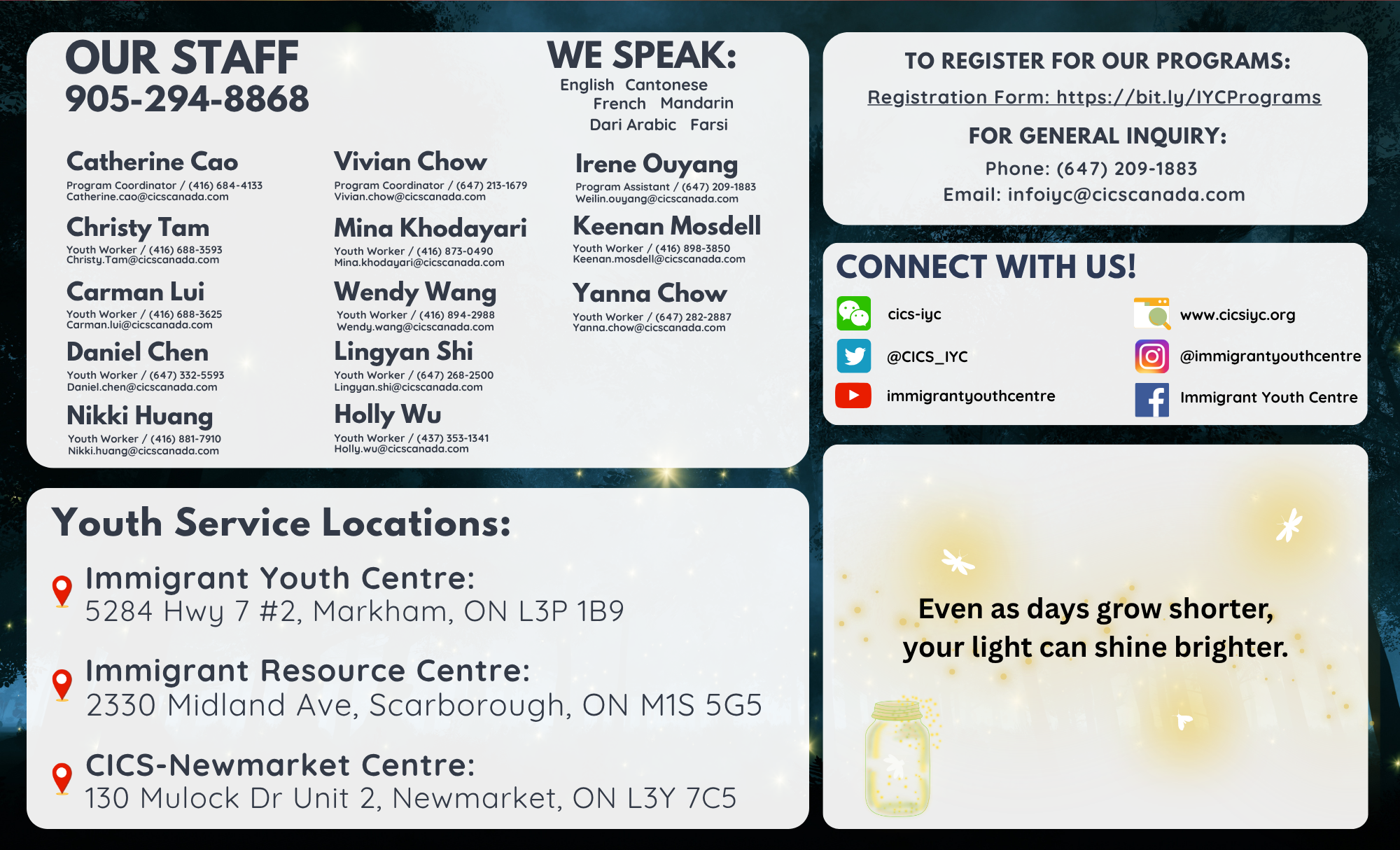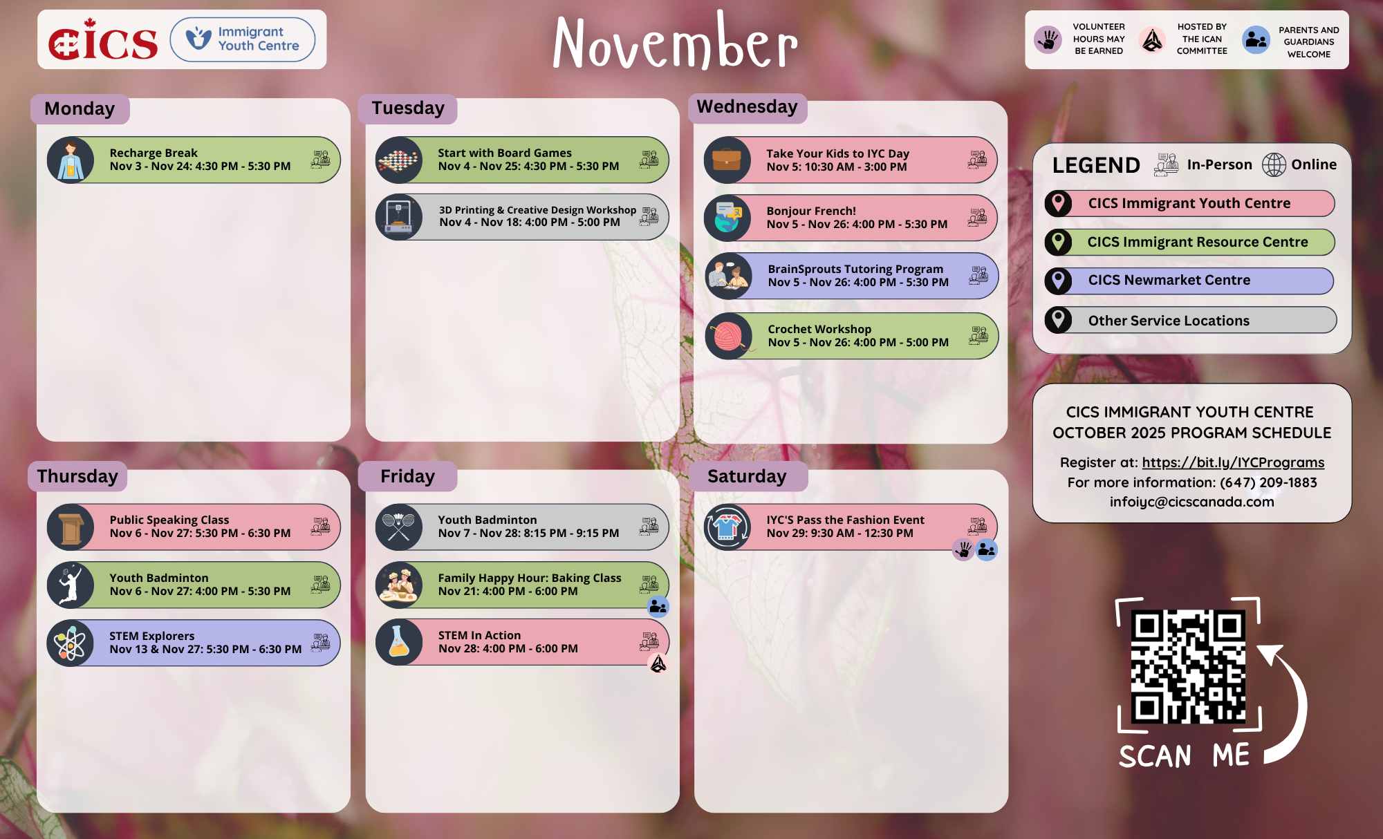 Want to connect with your community more? Learn about Toronto's culture? Forming healthy connections with your local community is important because it helps you to feel more comfortable with your surroundings and helps you make more friends and connections with others. We offer many programs and opportunities for youth to explore and connect. This includes hosting social events, game nights, and field trips to certain areas around the GTA! One of our goals is to help newcomers feel more safe, comfortable and adapt to the new home and community.